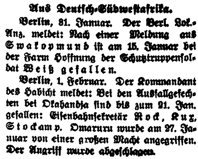 "Aus Deutsch-Südwestafrika. Berlin, 31. Januar. Der Berl. Lok.-Anz. meldet: nach einer Meldung aus Swakopmund ist am 15. Januar bei der Farm Hoffnung der Schutztruppensoldat Weiß gefallen. Berlin, 1. Februar: Der Kommandant der Habicht meldet: Bei den Ausfallgefechten sind zum 21. Jan. bei Okahandja gefallen: Eisenbahnsekretär Rock, Kux, Stockamp. Omaruru wurde am 27. Januar von einer großen Macht angegriffen. Der Angriff wurde abgeschlagen."
