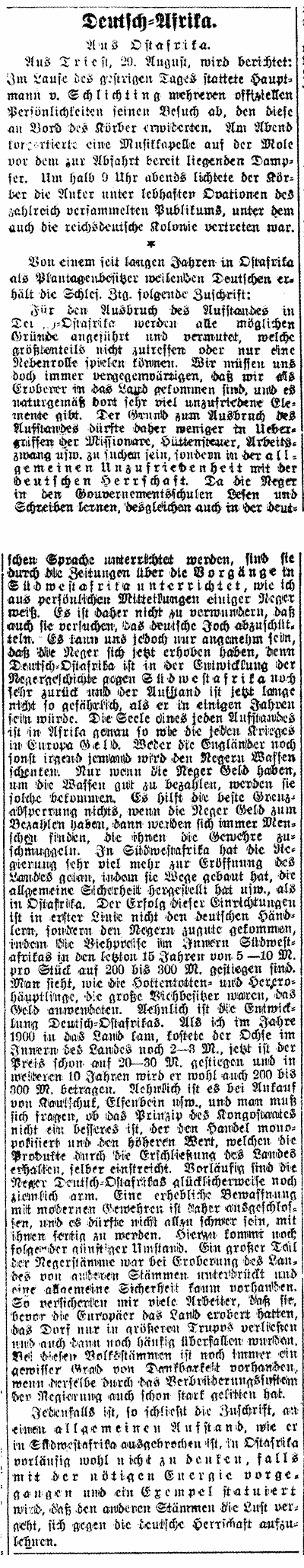 Aus Triest, 29. August, wird berichtet: Im Laufe des gestrigen Tages stattete Hauptmann v. Schlichting mehreren offiziellen Persönlichkeiten seinen Besuch ab, den diese an Bord des Körber erwiderten. Am Abend korportierte [?] eine Musikkapelle auf der Mole vor dem zur Abfahrt bereit liegenden Dampfer. Um halb 9 Uhr abends lichtete der Körber die Anker unter lebhaften Ovationen des zahlreich versammelten Publikums, unter dem auch die reichsdeutsche Kolonie vertreten war.